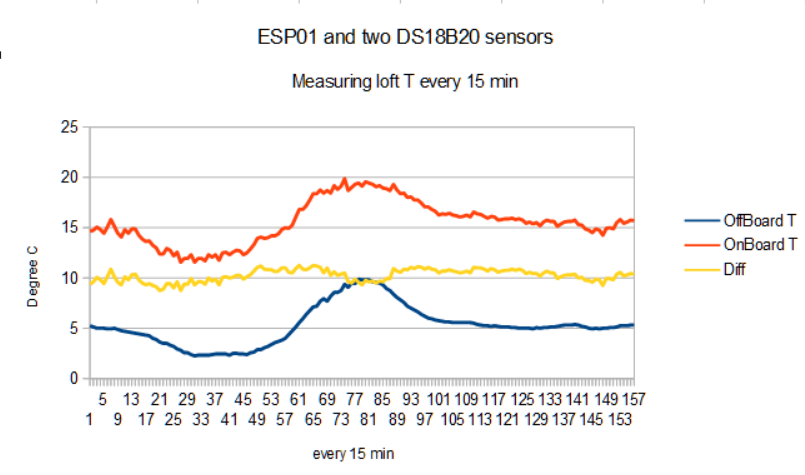 I also brought some waterproof DS18B20 with 1M leads, so I soldered a second DS18B20 in parallel with the one on the blue board. This was mot afected by the temperature of the ESP01.